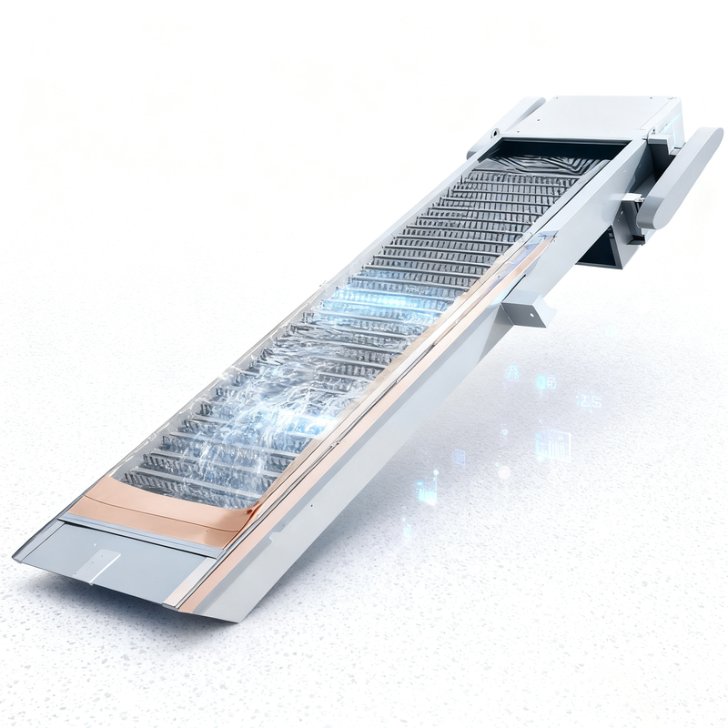 Wenn die Zinkenkette zum Oberleder und zur Rückseite der Ausrüstung transportiert wird, wegen der leitenden Rolle des Kettenrads und der gebogenen Schiene, können die parallelen Zinkenreihen verrückt werden, damit der feste Schmutz in die Schlackennut durch sein eigenes Gewicht fallen kann. Wenn er sauber herunterfällt, ist diese Art des Gitters einfach, den Schmutz in den Kanal hinter das Gitter zu holen.