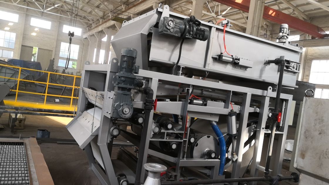 Die Ausrüstung besteht hauptsächlich aus einem Gurtdickungsmittel und einer Entwässerungsmaschine..Unter dem Einfluss der Schwerkraft fließt das Abwasser in den Schwerkraft-Entwässerungsbereich.in den Wassersammeltank gelangt, und wird dann durch den keilförmigen Vorkompressionsbereich geleitet, so dass der Schlamm allmählich ausgeglichen und leicht gepresst wird, damit er weiter dehydriert,und dann in den S-förmigen Multi-Roller in den Pressen Abschnitt, wird der Schlamm zwischen den oberen und unteren Filtertüchern eingeklemmt und durch mehrere Spitzen unterschiedlichen Durchmessers wiederholt gepresst.Der Schlamm wird geschnitten und weiter entwässert, um einen Schlammkuchen zu bilden.Schließlich wird der Schlamm mit einem Schaber entfernt, der Kuchen abgeschraubt und transportiert, der obere und der untere Filtergurt gewaschen und dann wiederverwendet.